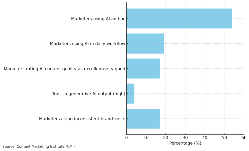 AI is everywhere, but strategic use is rare. Only 17% of marketers rate AI content as excellent, and just 4% highly trust it. With 54% using AI ad hoc and 17% citing brand voice inconsistency, it is misalignment, not the technology, that is holding results back.