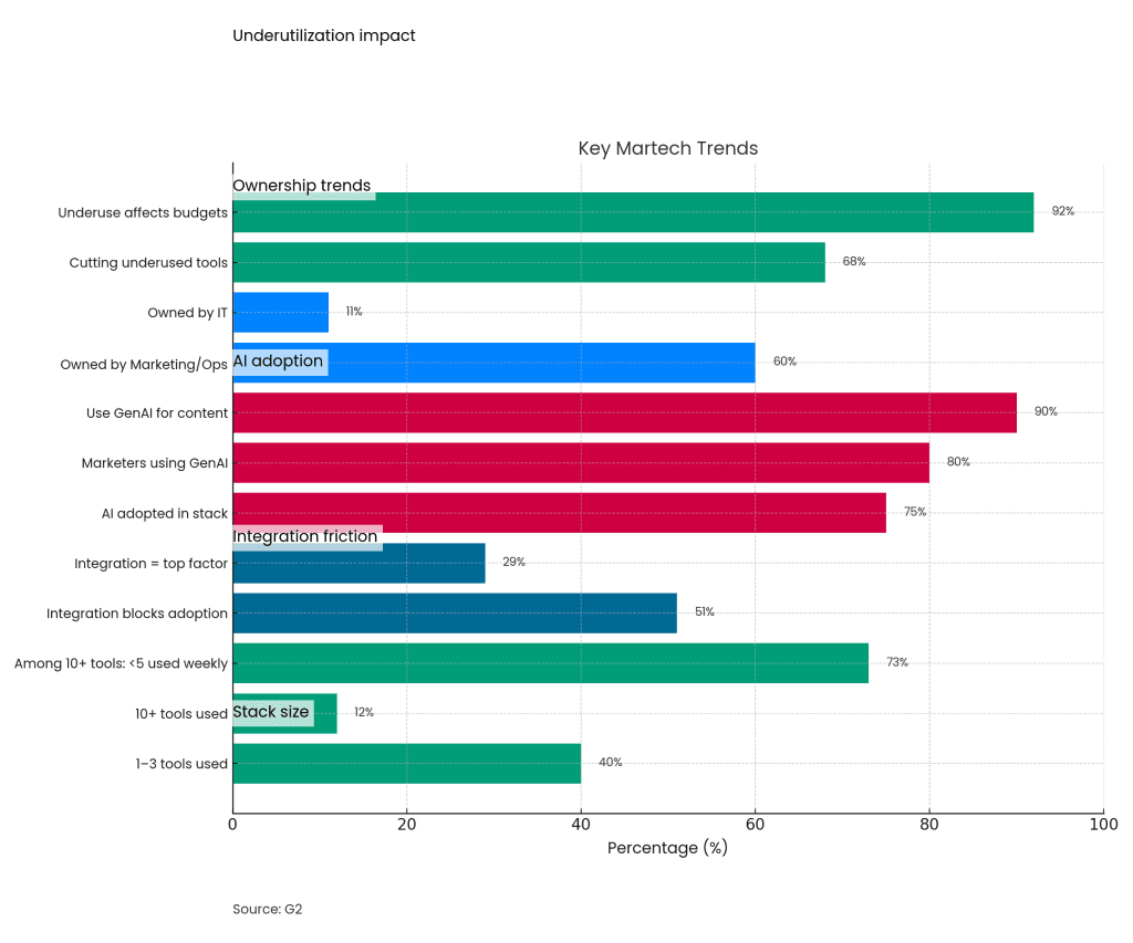 Only 12% of companies operate with 10 or more marketing tools, and even among those, 73% use five or fewer tools weekly (G2, 2024). The perception of large stacks often masks the real issue: tool overreach without alignment. Despite wide adoption, 68% of marketers say underutilized tools will be cut, and 92% of enterprise teams admit underuse threatens future budgets.