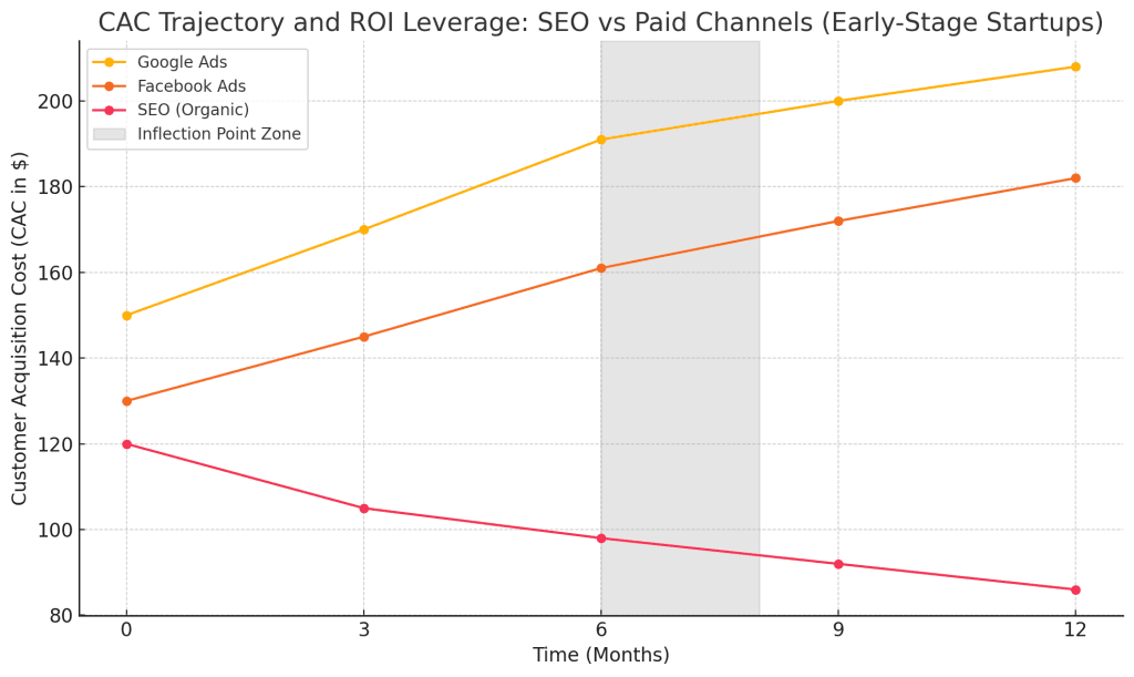 This is where a structured SEO growth strategy for early stage companies differentiates from ad-first models: it compounds under fixed budget ceilings rather than scaling linearly with cost.