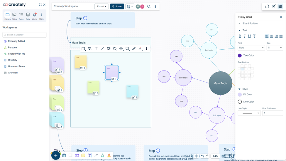 On the workspace, you have access to a library of templates, shapes, and diagrams, with customization options that let you tweak everything to your heart’s content. Plus, Creately’s infinite canvas is a game-changer. No more getting stuck with limited space; let those creative juices flow freely!