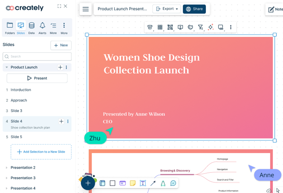 - Presentation mode is a nice touch, allowing you to present directly from Creately without switching apps.
