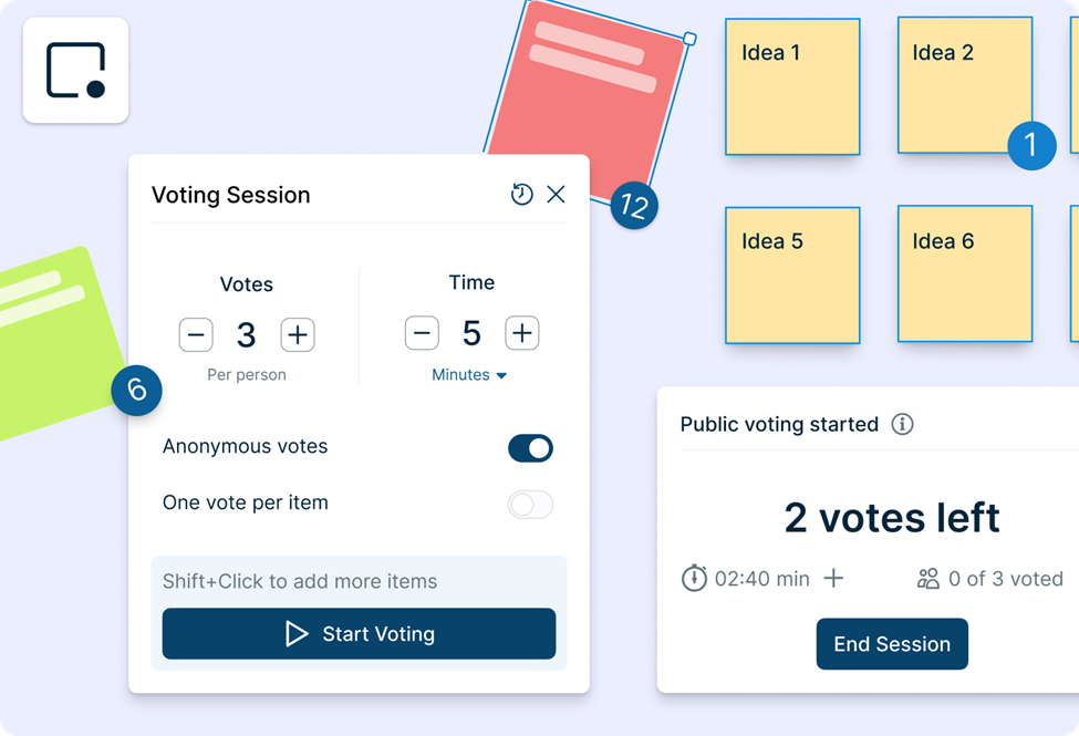 - The voting session status shows up in the bottom right corner for everyone. You’ll see indicators next to items, showing how many votes each has.