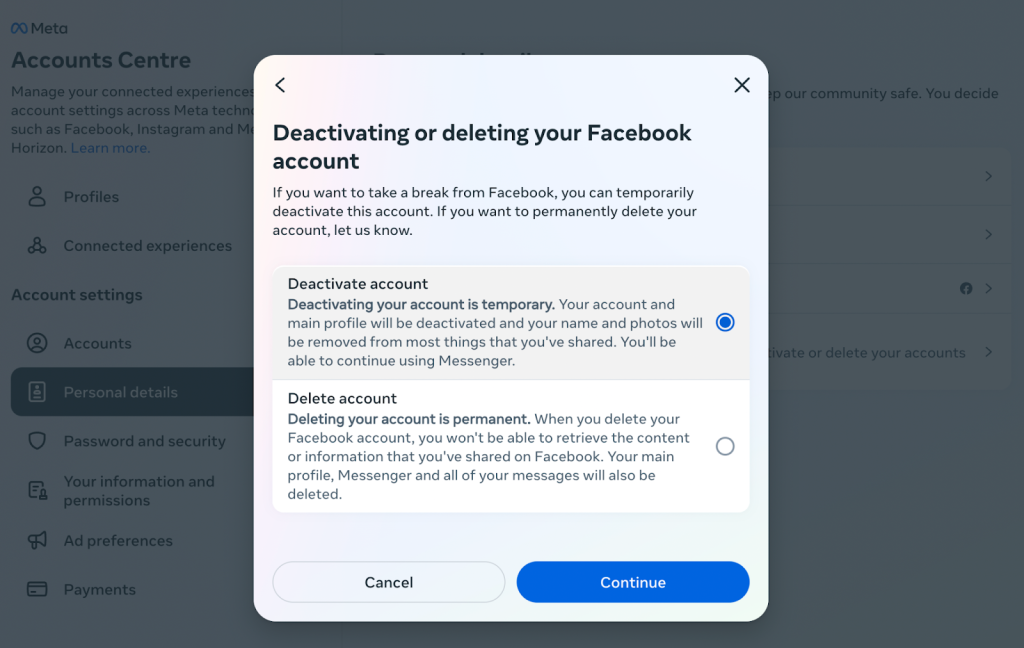Remember, should you have a change of heart within 30 days, you can reverse the deletion by logging back in using your username and password.